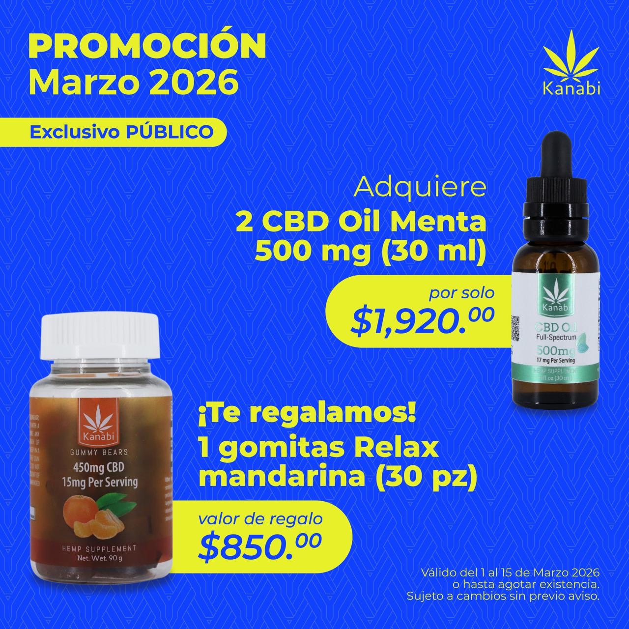 Llévate 2 cbd oil sabor menta por solo $1,920 y llévate 1 Gummy mandarina RELAX completamente Gratis.